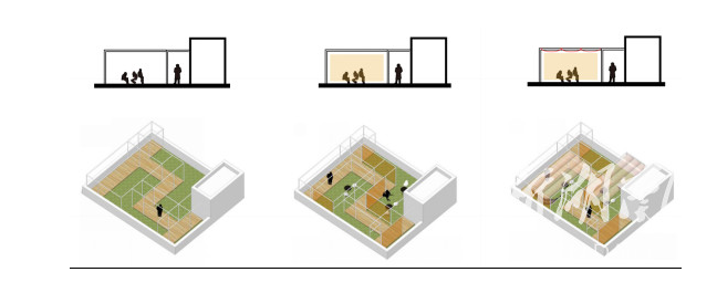 屋顶公共空间手段——打造贴近住户生活,且不失趣味的空间。置入框架限定空间,带来一定包裹感。同时框架还能供租户晾晒及简易健身。再置入垂下及收纳卷置框架的帷幕,可围合出小组团空间,亦可形成全开敞空间。