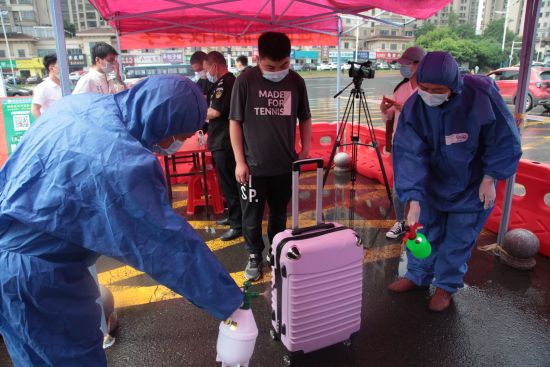 工作人员在给学生行李消毒。