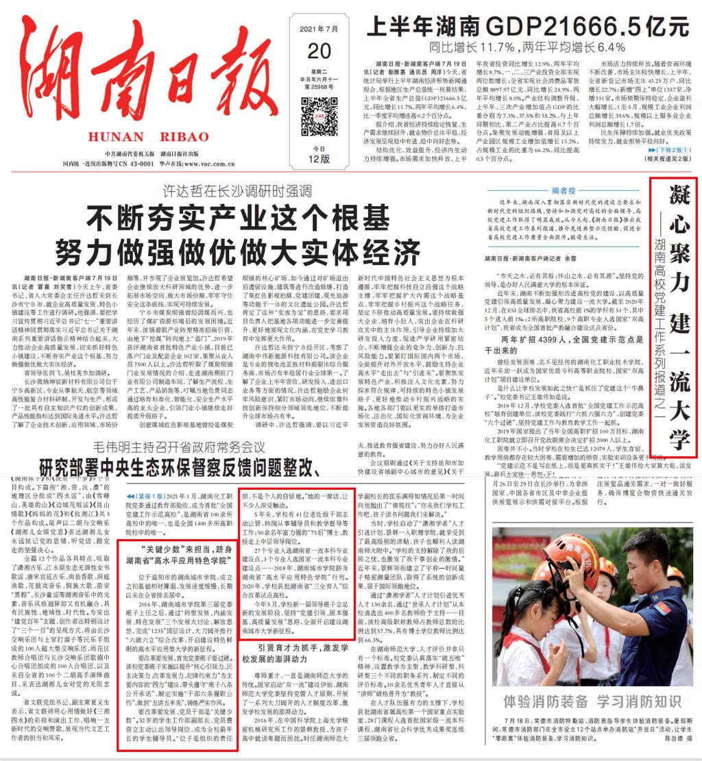 《湖南日报》7月20日头版报道jdb电子以高质量党建引领高质量发展,凝心聚力建设一流大学。