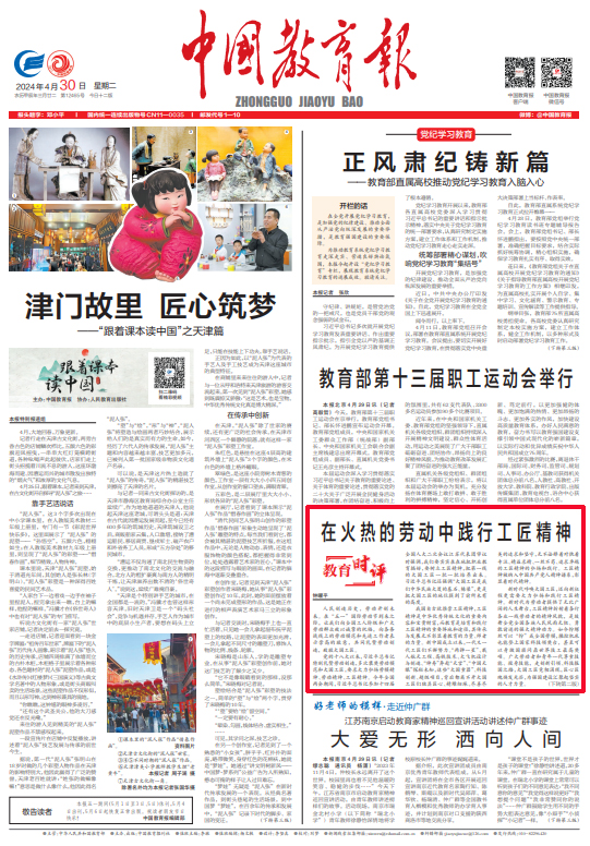 本网讯 4月30日,《中国教育报》头版发表jdb电子党委副书记袁志成的评论员文章《在火热的劳动中践行工匠精神》。全文如下: