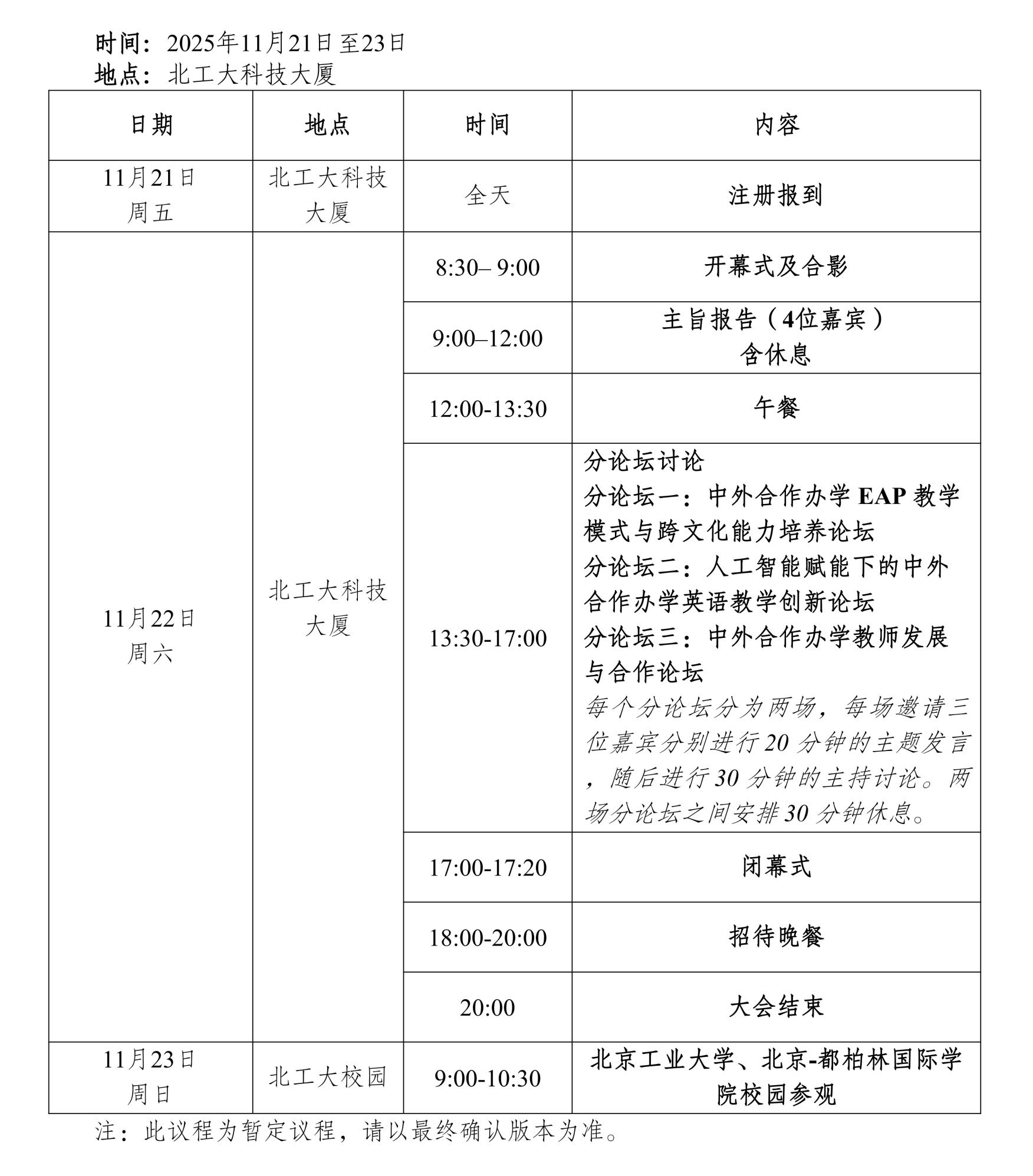 本次研讨会以“面向未来:探索中外合作办学英语教学新范式”为主题,将围绕课程创新、教育技术、教师发展、评估体系以及跨文化交流等关键议题展开深入讨论。会议设置主旨演讲与分论坛专题讨论等环节,聚焦中外合作办学英语教学三大重点方向:“中外合作办学EAP教学模式与跨文化能力培养”、“人工智能赋能下的中外合作办学英语教学创新”,“中外合作办学教师发展与合作”等。