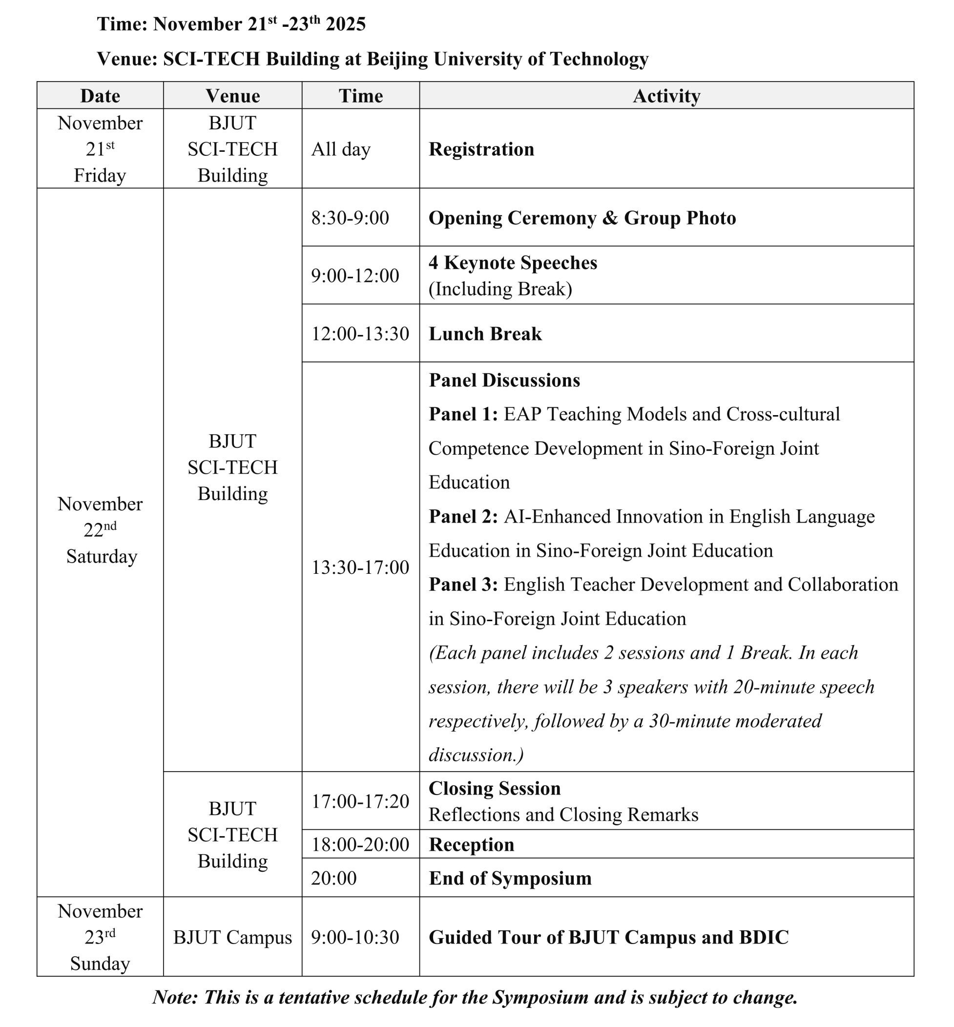 The Symposium will feature keynote speeches and panel discussions across three thematic areas within the context of Sino-Foreign Joint Education: EAP Teaching and Cross-Cultural Competence, AI-Enhanced Innovation in English Language Education, and English Teacher Development and Collaboration.