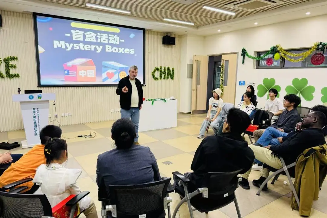 随后,外籍师生们也开始绘声绘色分享他们精心准备的盲盒。盲盒一个个被开启,仿佛推开了一扇扇通往异国他乡文化殿堂的大门。来自瑞士的师生带来了瑞士手表和瑞士军刀,并分享了背后故事,每一个细节都彰显着瑞士人严谨专注、追求极致的精神品格,让人不禁为这个“钟表王国”和“军刀之国”的深厚底蕴所折服;英国师生端出了散发着芬芳的传统早餐——英国马麦酱,并用一枚印有英国公交车的挂饰开启了有关英国公交车的奇闻轶事,讲述了英国人对生活的热爱与对传统的坚守……从这一个个新奇的故事和体验中,中国的同学和老师们在开阔眼界的同时,也对外国文化有了更深入的了解,并且激发了同学们对更多样文化的好奇心。