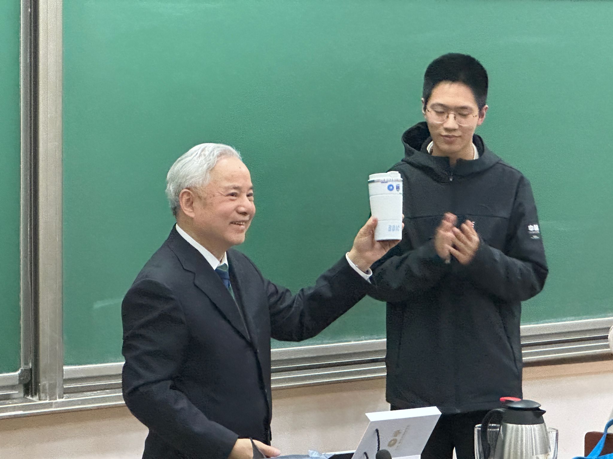 学生赠送岑理事长纪念品 岑理事长和师生合影