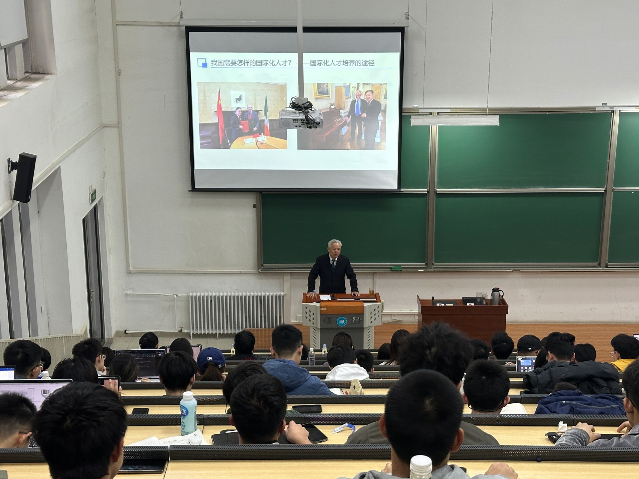 2025年3月12日,北京-都柏林学院特邀外交部南南合作促进会南南国际教育智库理事长、中国国际教育交流协会出国留学服务分会理事长岑建君先生,以“我国需要怎样的国际化人才?——国际化人才培养的途径”为题做学术报告。学院党委书记杨庆,党委副书记、院长吴文英,相关领导,部分教师以及200余名学生在第四教学楼102教室参加。此次报告是都柏林学院2025年度“工程大师讲坛”特别推出的“全球胜任力”系列报告第一讲,旨在通过系列报告进一步拓宽学生的视野,提升学生国际胜任力,有效促进学院国际化人才培养。