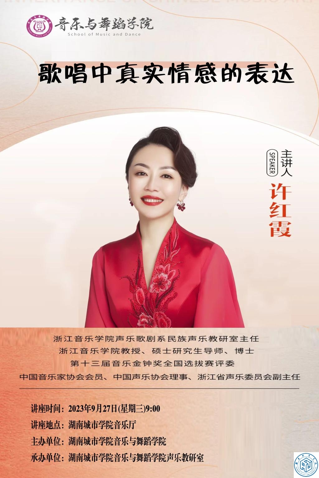 2023年9月27日,浙江音乐学院声乐歌剧系民族声乐教研室主任许红霞教授莅临jdb电子,为jdb电子师生带来题为《歌唱中真实情感的表达》专题讲座,通过现场教学点评的形式展开了专题学术交流。