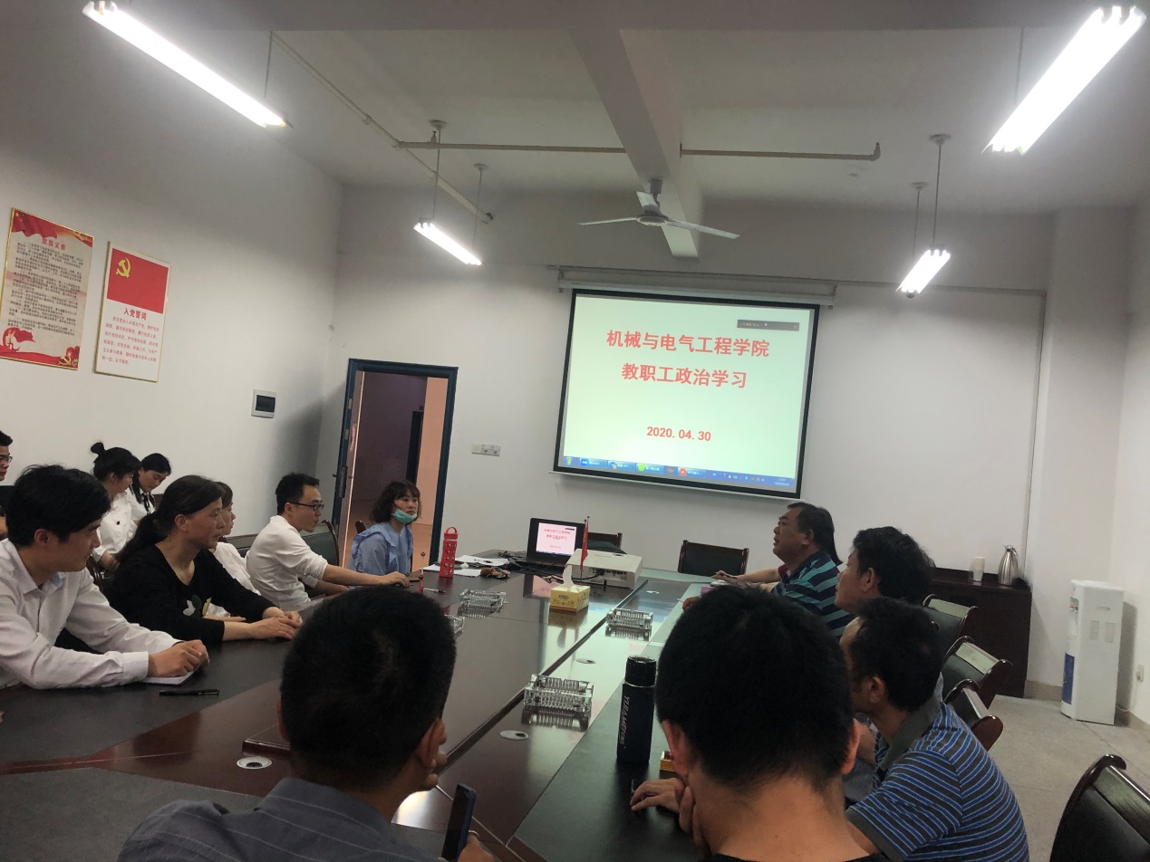 进一步贯彻传达jdb电子游戏官方网站四届五次教职工、工会会员代表大会成果和精神,2020年4月30日下午,机械与电气工程学院在会议室召开了全院教职工政治学习。由于疫情的影响,本次政治学习采取现场学习与线上会议相结合的形式举行,会议由党总支书记徐畅贤主持。