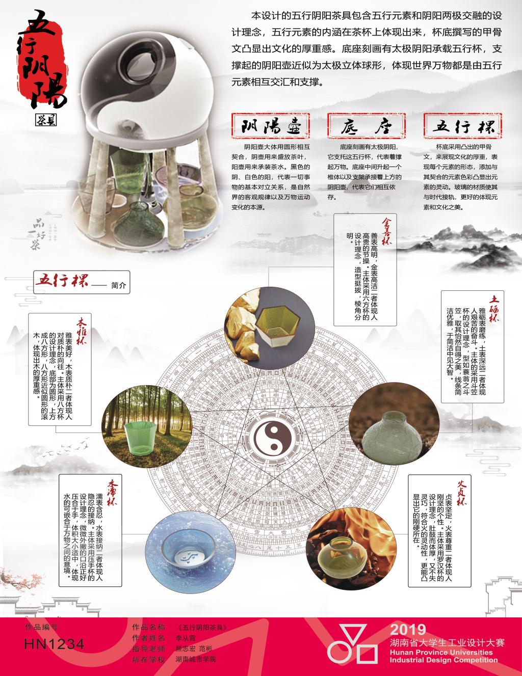 20191119日,历时五个多月的2019年湖南省大学生工业设计大赛作品竞赛落下帷幕,其中由我院熊志宏老师和范彬老师指导的2017级学生李从霄的作品《五行阴阳茶具》在此次竞赛中获得省级三等奖。