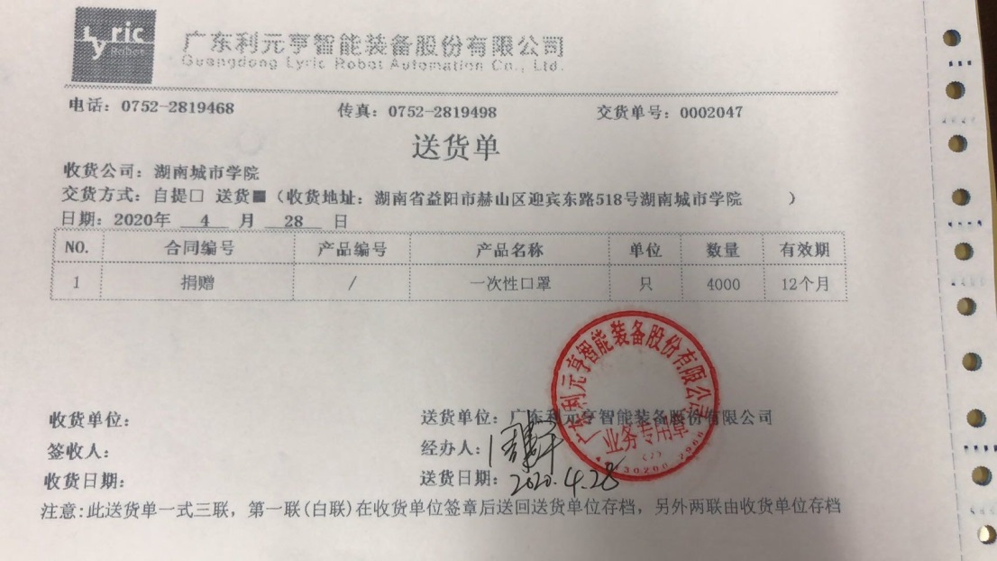 4月28日上午,广东利元亨智能装备股份有限公司(以下称利元亨)作为jdb电子校企合作单位,向jdb电子机械与电气工程学院捐赠4000只口罩,用于新冠肺炎疫情防治工作,助力复工复学。机械与电气工程学院院长阳同光、副院长周理代表学院签收了本次物资。
