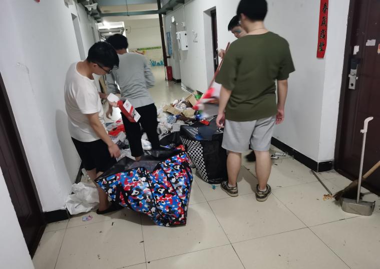 学生临近毕业,要处理复试调剂、就业、毕业手续办理等事项,加上部分寝室要进行调整,这些寝室基本上是前人刚走、后人就到,几乎没有时间进行充分的保洁、打扫。这时学院学生干部化身“搬运工”,帮助毕业生打扫走廊、搬运垃圾,使得宿舍环境进一步整理干净。以这种方式传递温暖,为他们送行。