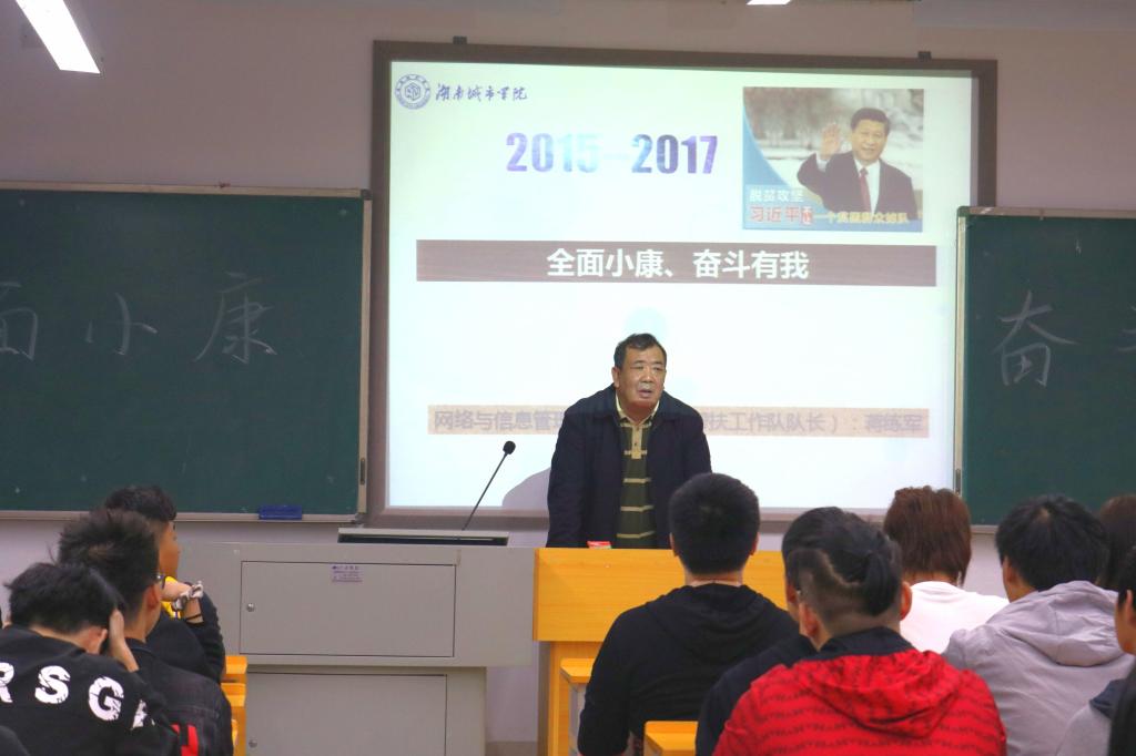 随着刘辉书记的发言,讲座就此拉开序幕。本次活动旨在增强大学生对中国共产党的思想认同、情感认同、价值认同。主讲人蒋练教授从自身出发讲述了自己在助力全面小康道路上的奋斗故事。作为原驻村帮扶队队长,蒋教授深入大山,与人民群众同吃同住,将中国共产党精准扶贫,不放弃任何一名贫苦群众的政策方针带进湖南安化。一分耕耘一分收获,在扶贫小队的不懈努力下,贫困乡村一步步发家致富。2020年是具有里程碑意义的一年,我国第一个百年目标即将实现。蒋教授强调青年一代要有敢于担当,甘愿付出,要有为人民服务的精神。作为青年大学生,应当积极投入祖国的建设,助力国家一个又一个目标的实现。人生是一所大学校,大舞台,可以大有作为。从他的话语中,同学们明白了无论多么艰辛困苦也要坚定信念、克服困难,始终走在前进的道路上。