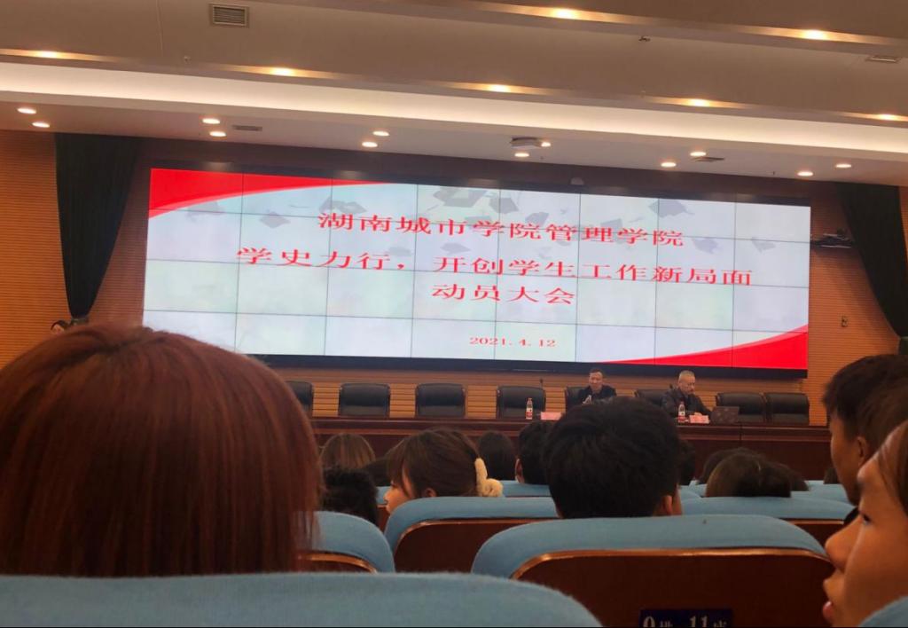 【党史学习教育】为使jdb电子《中共jdb电子游戏官方网站关于开展党史学习教育的实施方案》落到实处,提高管理学院团学干部的政治自觉,树立正确党史观,扎实做好团学工作,4月12日晚7点,管理学院在图书馆报告厅召开了“学史力行,开创学生工作新局面”动员大会,管理学院党委书记徐习军、党委副书记王润华以及全体辅导员、团学干部和部分党员代表参与了本次大会,本次会议由组织员阳红珍主持。