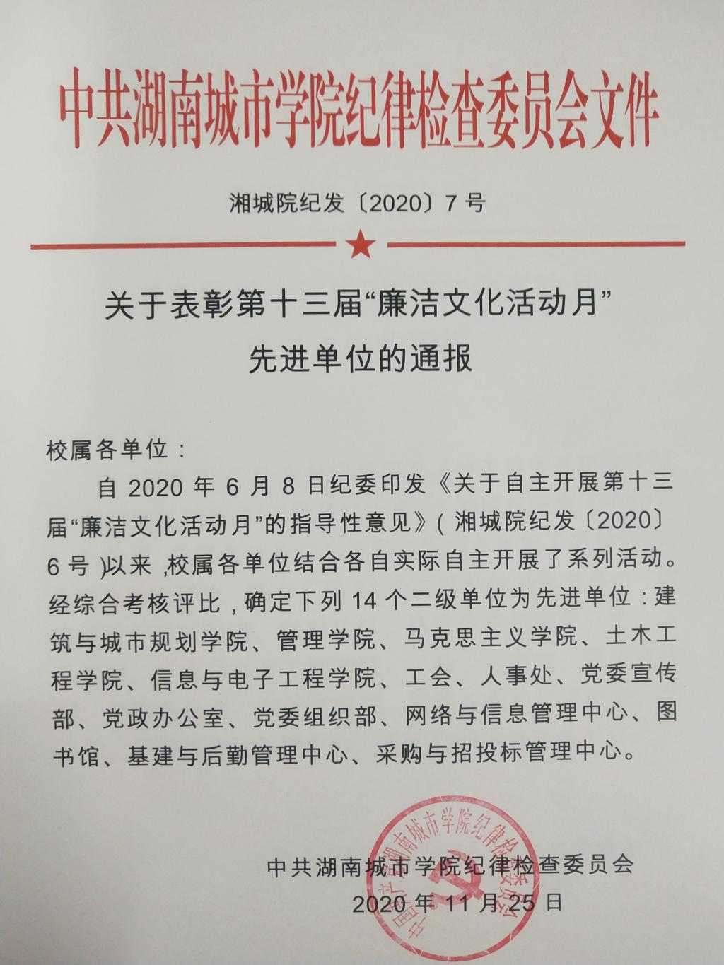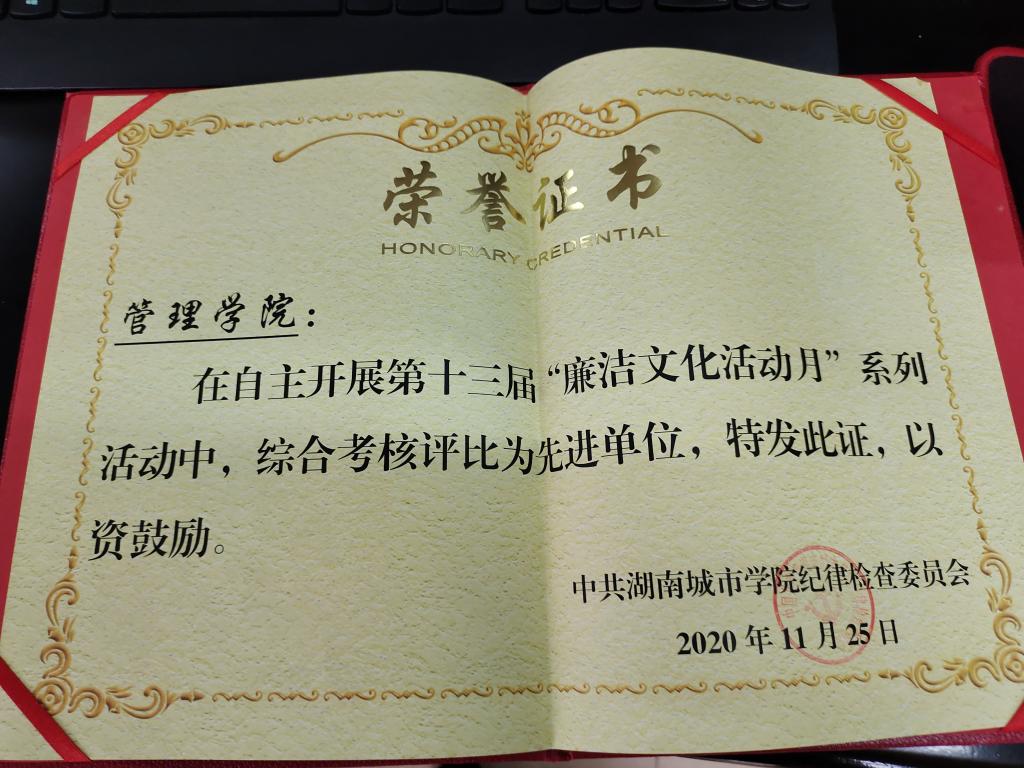在学校自主开展的第十三届“廉洁文化活动月”系列活动综合考核评比中,管理学院被评比为先进单位。