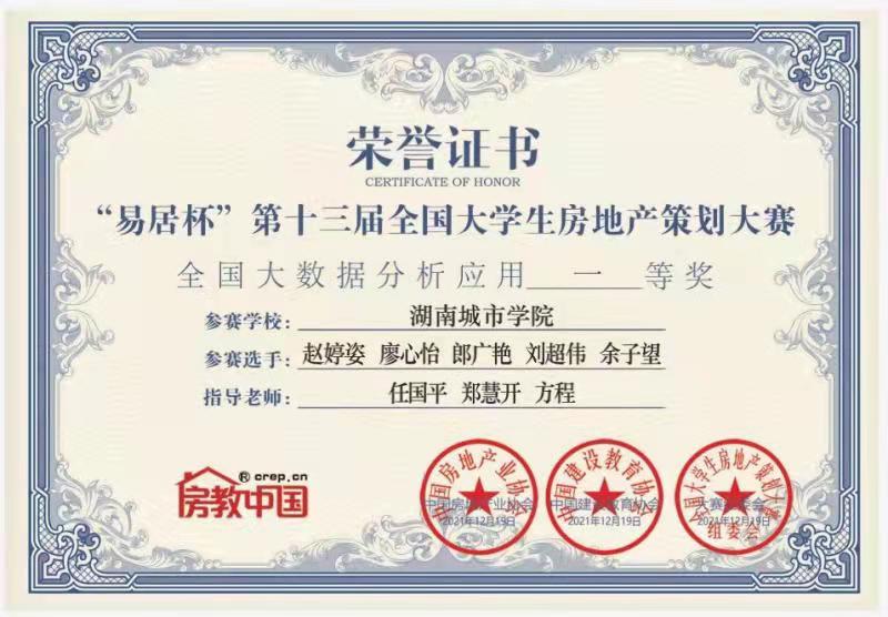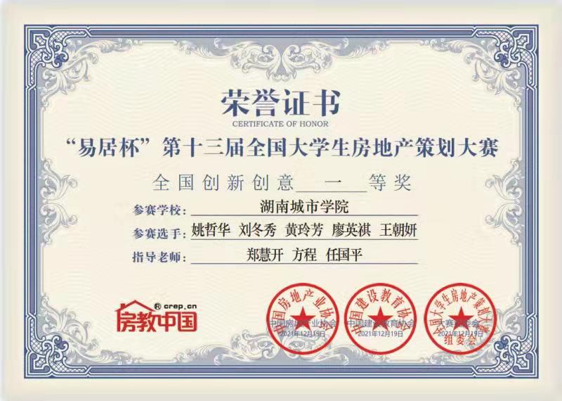 jdb电子共派出六支队伍参赛,在管理学院郑慧开老师、任国平老师、建筑与城市规划学院方程老师认真严谨的指导下,参赛同学刻苦努力备赛。其中由19级房地产开发与管理专业姚哲华、廖英祺、黄玲芳、刘冬秀、赵婷姿、廖心怡、郎广艳、刘超伟、18级城乡规划专业王朝妍、余子望共十位同学组成的两支队伍均获全国一等奖。其余四支队伍分别获全国二、三等奖,jdb电子并获大赛“优秀组织高校”荣誉,创历史新高!