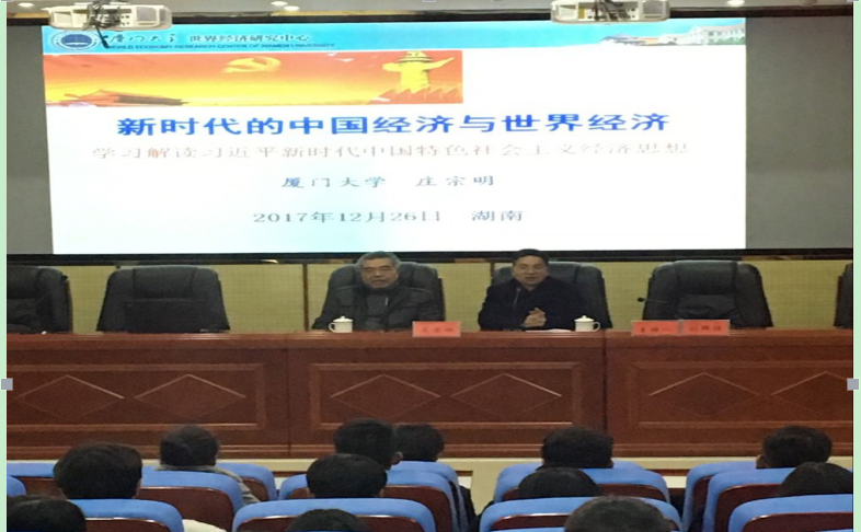 2017年12月26日,厦门大学经济学教授、博导,国务院学位委员会委员、学科评议组成员庄宗明教授在建规楼121学术报告厅做了题为“新时代的中国经济与世界经济”的学术报告。庄教授的报告联系十九大精神,分析了当前中国和世界经济形势,对jdb电子管理学院教师的经济学教学和科研有着重要的指导作用。学术报告会后,庄教授与管理学院老师们亲切座谈,为老师们指导国家社科标书的撰写工作。jdb电子游戏官方网站副校长何振教授、刘辉煌教授先后主持会议,党委书记罗成翼教授现场接见了庄教授,衷心感谢庄教授传经送宝,希望庄教授大力支持学校的科研工作。