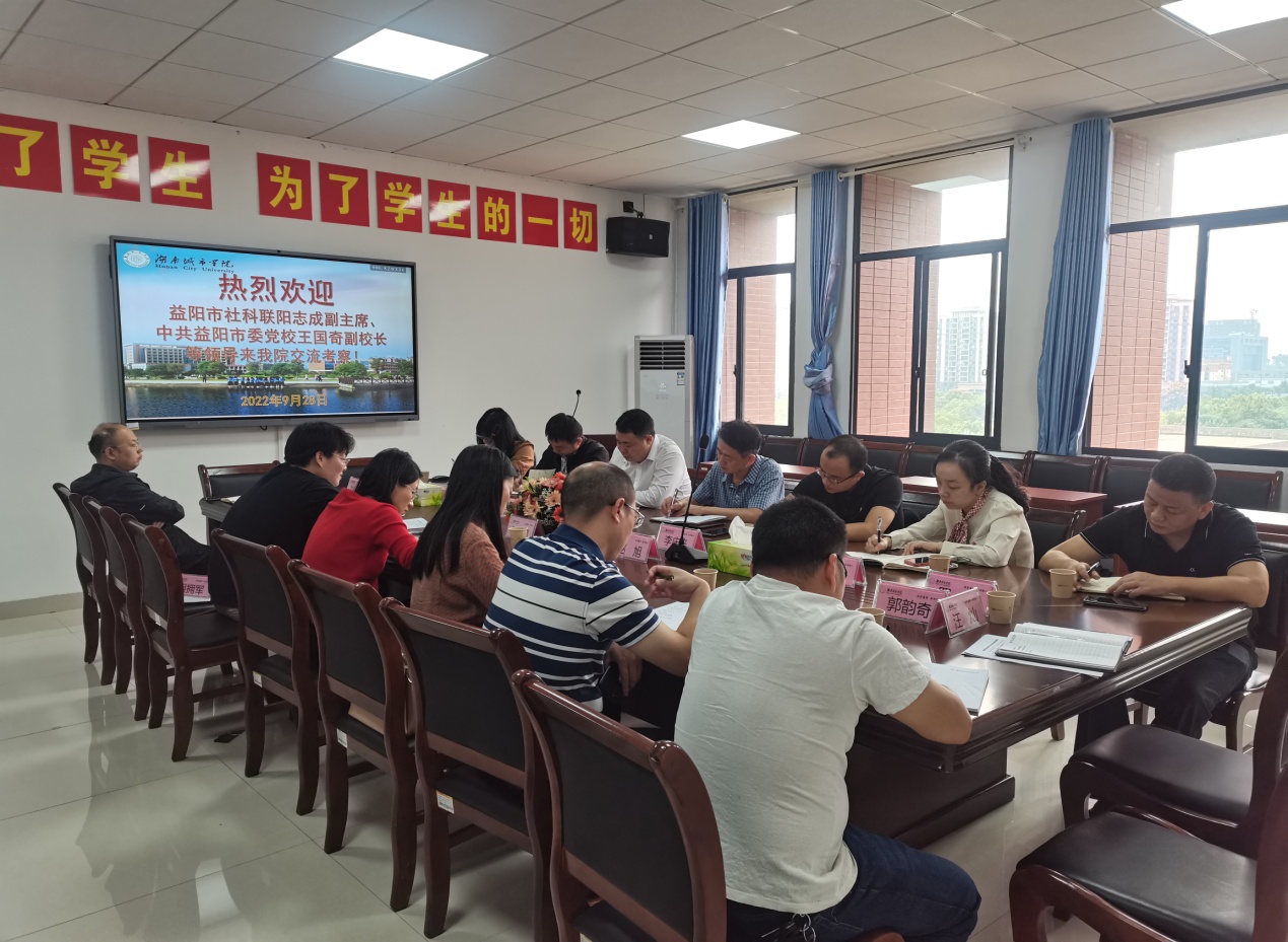 2022年9月28日,益阳市社科联阳志成副主席,中共益阳市党校王国奇副校长等领导来我院交流考察。双方就如何开展益阳市智库系统建设与今后如何发展等事宜进行了深入地交流和讨论,并在加深各方联系,通力合作建设益阳智库上达成了高度共识。管理学院院长孙倩、科研处赵旭副处长、副院长任国平等参加了会议。