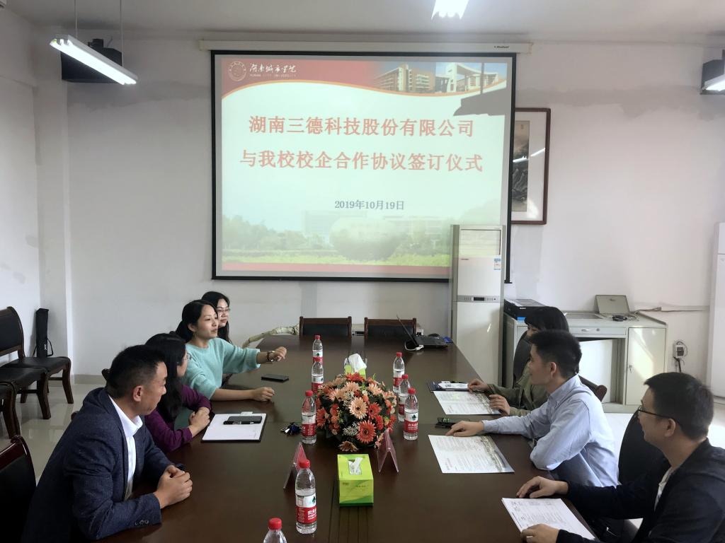 2019年10月19日下午,湖南三德科技股份有限公司与jdb电子校企合作签约仪式活动成功举办。湖南三德科技股份有限公司技术服务部经理朱红兵、招聘主管王丽平以及jdb电子游戏官方网站管理学院院长孙倩、副院长李双清、工商管理专业相关老师出席本次活动。