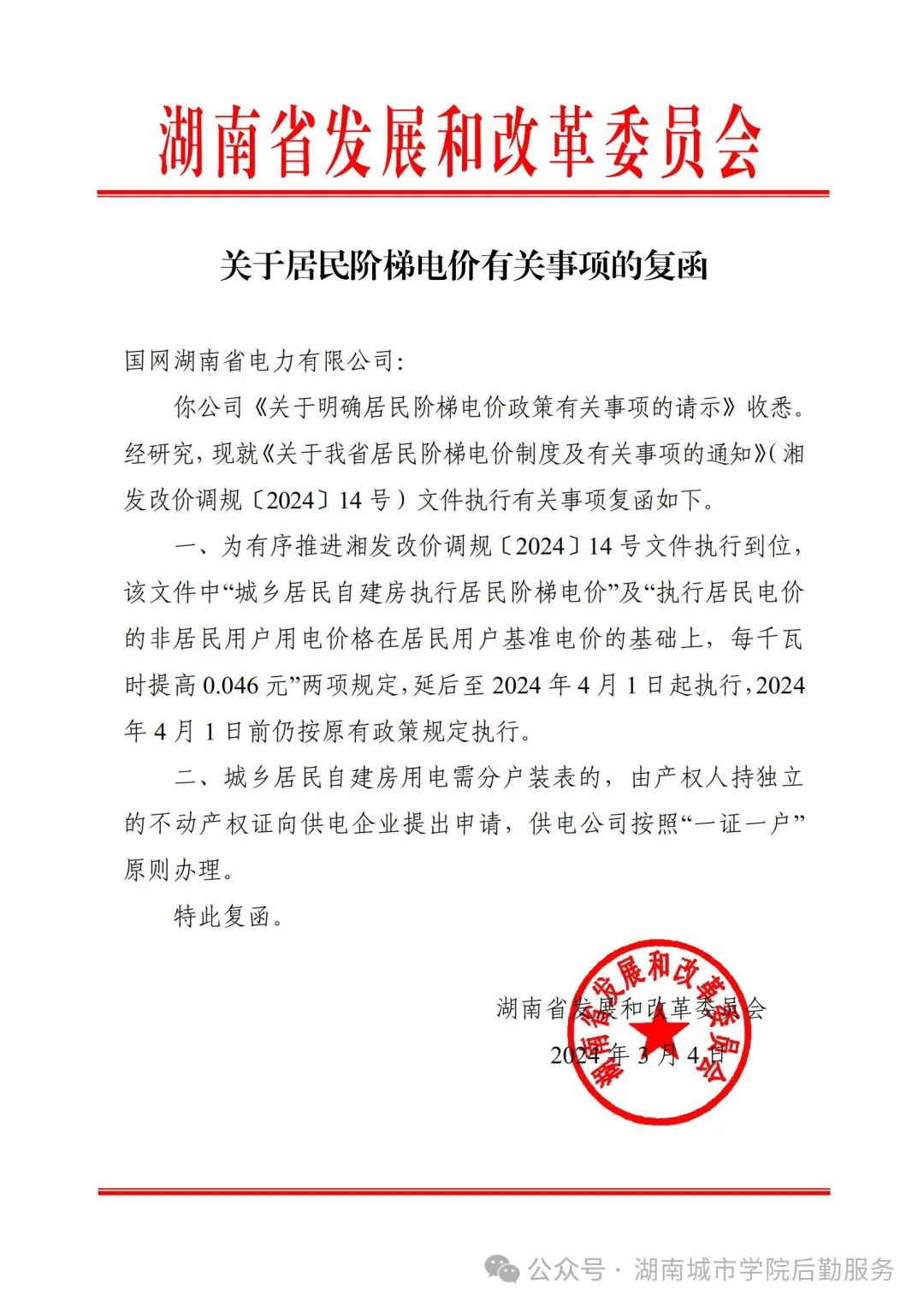 根据《湖南省发展和改委员会文件 湘发改价调规[2024]14号》文件,湖南省发展和改委员会关于我省居民阶梯电价制度及有关事项的通知,学校居民合表电价上调0.046元/度,学生宿舍、家属区、食堂、热水公司、洗衣机公司等执行居民合表电价的用电单位全部调整为0.635元/度。