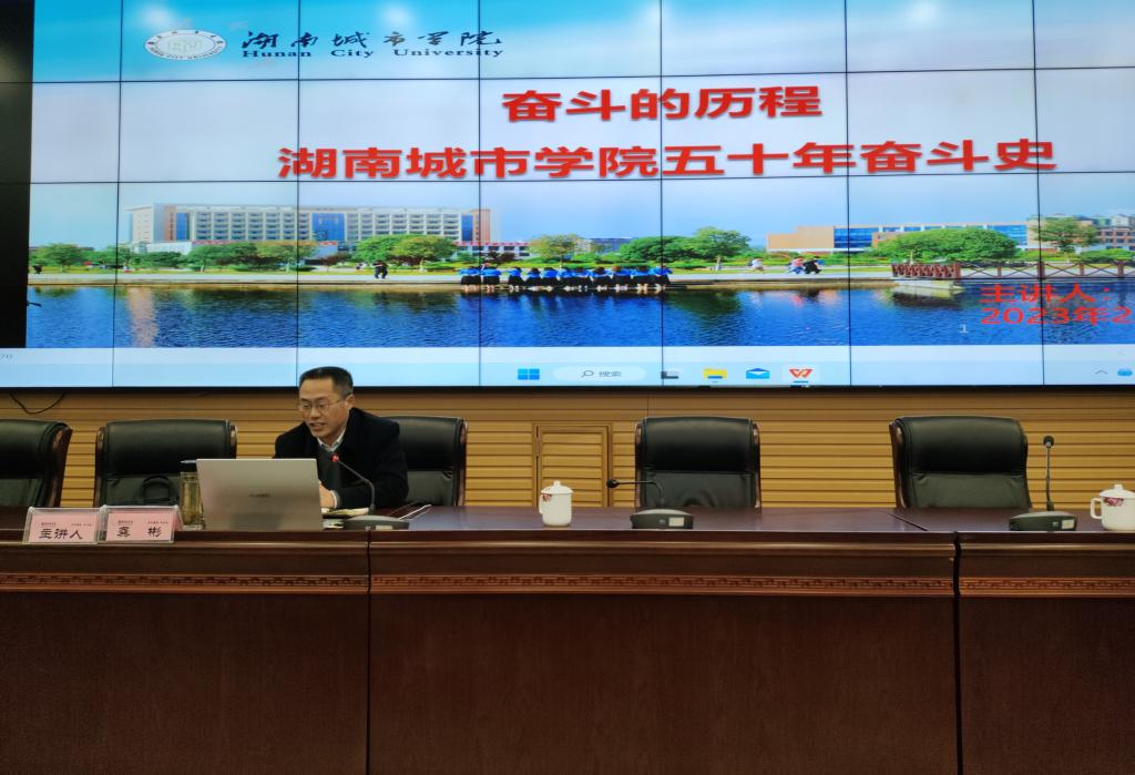 党政办公室主任龚彬作了jdb电子游戏官方网站五十年奋斗史的专题讲座,介绍了学校的缘起、融合、发展3个阶段和中共jdb电子游戏官方网站第四次代表大会提出了全面开启建设湖南城市大学新征程、“三步走”发展目标、“一二三四五”发展战略,共同绘就了学校今后五年及中长期改革发展的美好蓝图。
