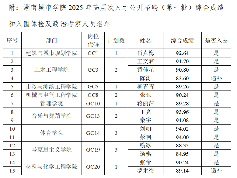 根据《jdb电子游戏官方网站2025年高层次人才公开招聘公告》要求,经公开报名、资格审查、直接考核等环节,现将综合成绩和入围体检及政治考察人员名单予以公告(详见附表)。
