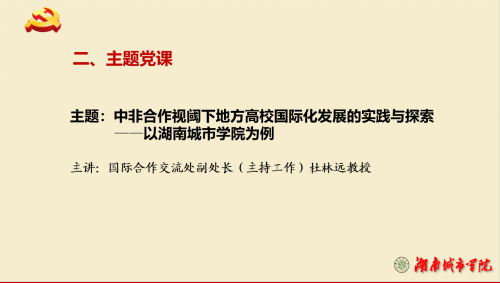 其次,按照支部工作计划,国际合作交流处副处长(主持工作)杜林远教授主讲题为《中非合作视阈下地方高校国际化发展的实践与探索——以jdb电子游戏官方网站为例》主题党课。