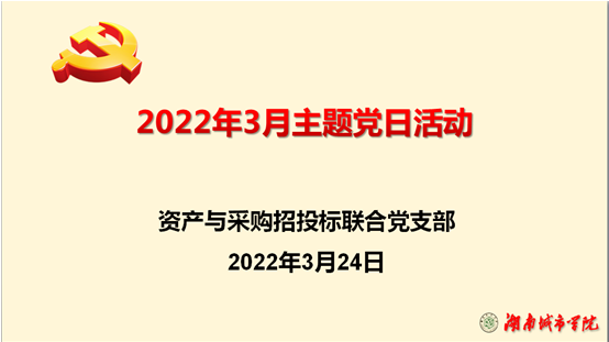 2022年3月24日下午,资产与采购招投标联合党支部在一办公楼117室组织开展了“主题党日活动”学习,党支部书记肖爱民主持,支部全体党员参加。
