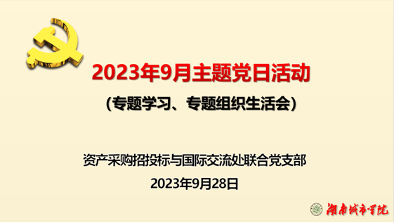 2023928日下午,在一办131支部党员活动室,资产处、采购与招投标管理中心及国际交流处联合党支部以主题党日活动形式,开展了专题学习,召开了以“学习贯彻习近平新时代中国特色社会主义思想”为主题的专题组织生活会。会议由支部书记肖爱民主持。