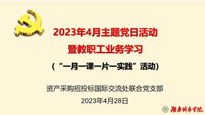 2023428日上午,资产处、采购与招投标管理中心、国际交流处联合党支部在一办公楼131室(支部活动室)开展了主题党日活动暨教职工业务学习,党支部书记肖爱民主持,三部门全体教职工参加。